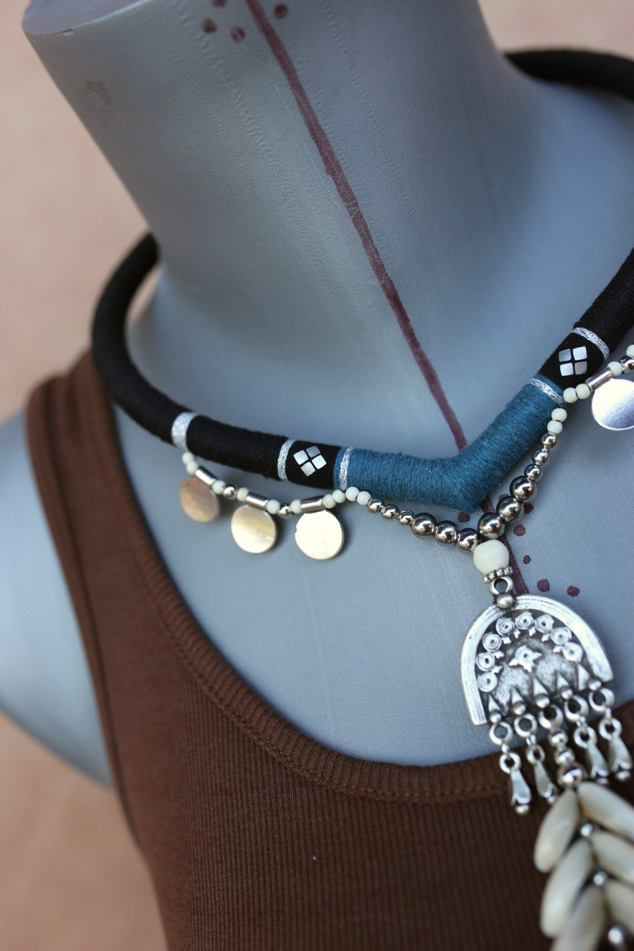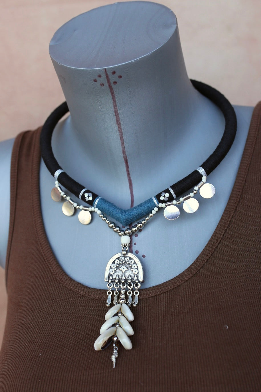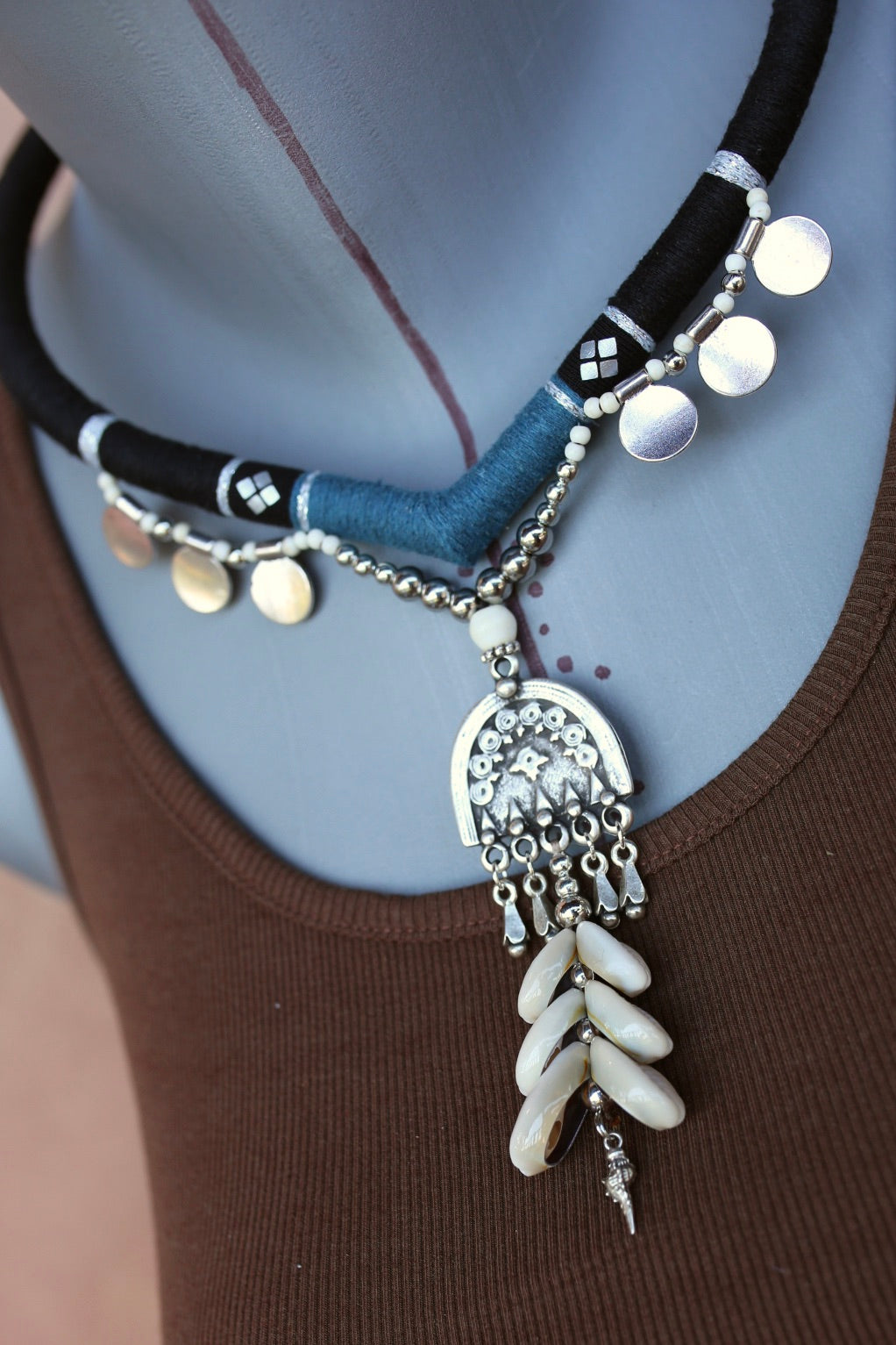 Torque en forme de pointe, habillé de fil de coton noir et bleu orné de motifs argentés et pampilles rondes. Son pendentif central gravé est agrémenté de coquillages naturels et d’une breloque coquille, pour un style marin et ethnique affirmé.