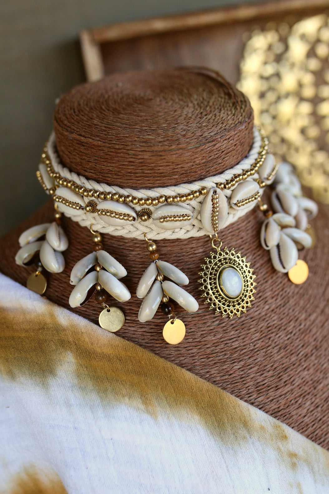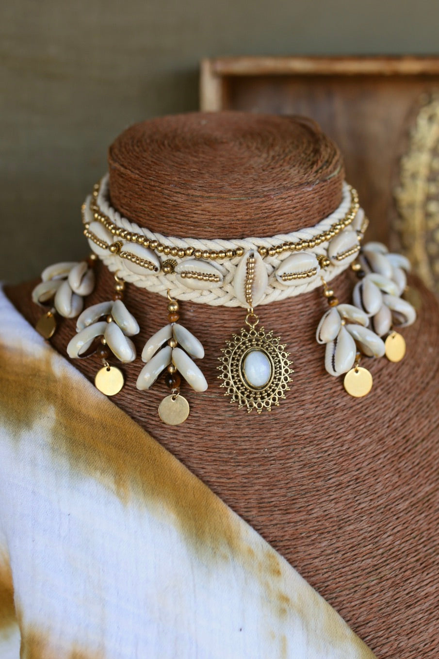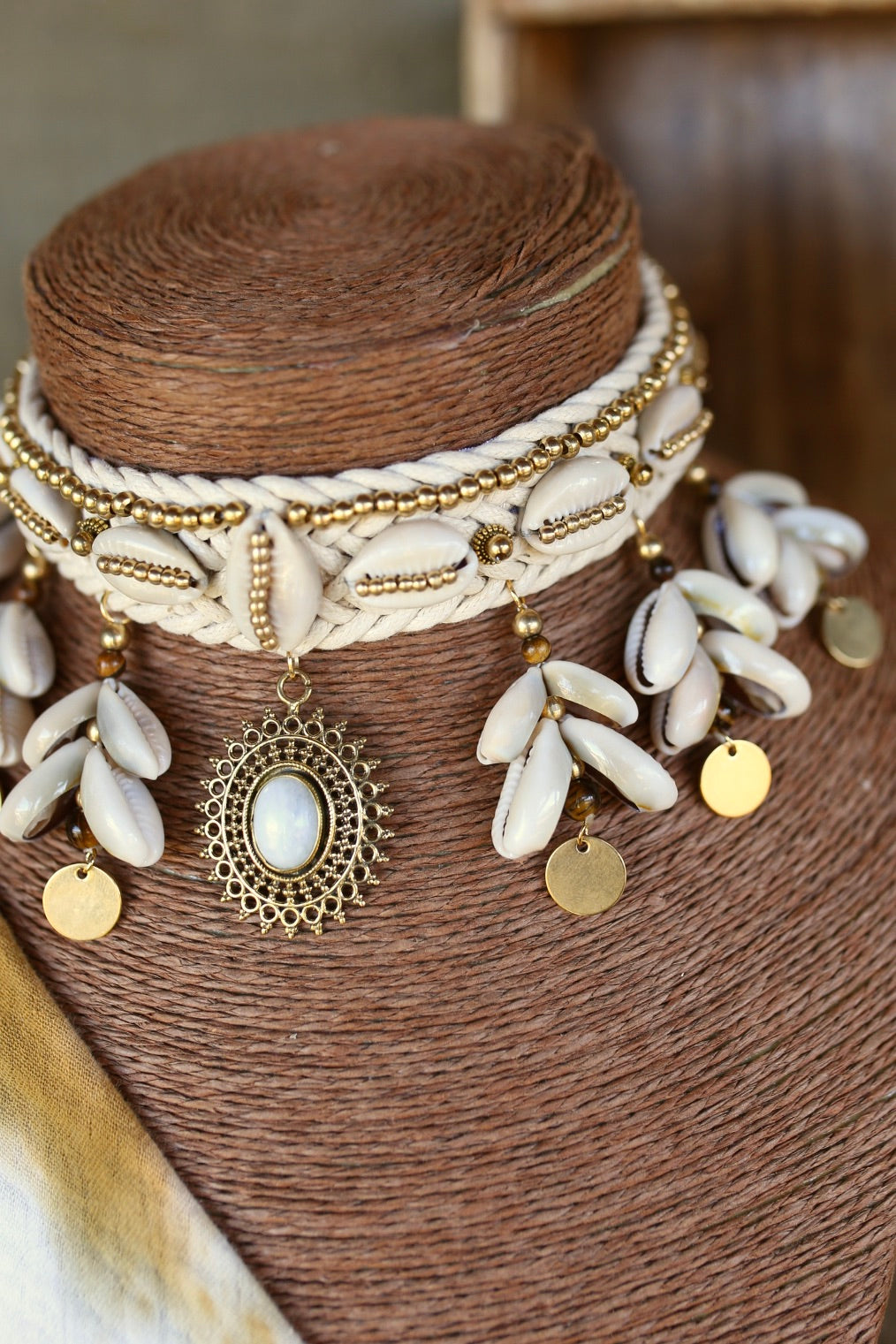 Ce ras de cou unique est une véritable ode à l’été et à l’artisanat. Entièrement fait main, il mêle des coquillages naturels, des perles dorées et une magnifique médaille centrale sertie d’une pierre de lune aux reflets doux. Monté sur une tresse écrue, il offre un contraste élégant et lumineux.