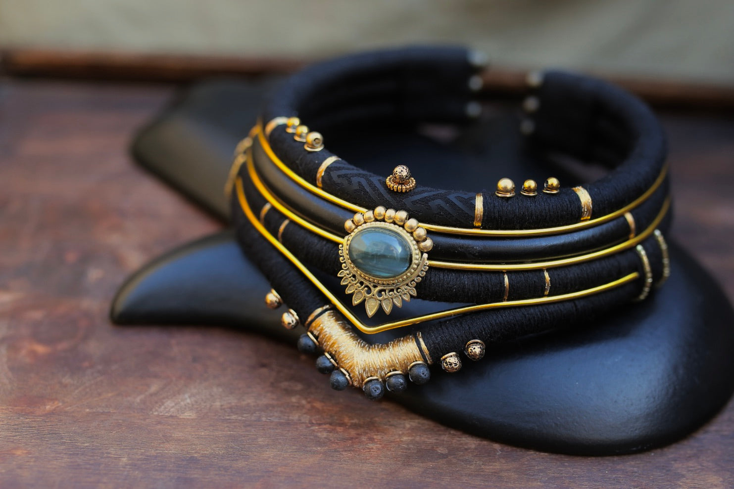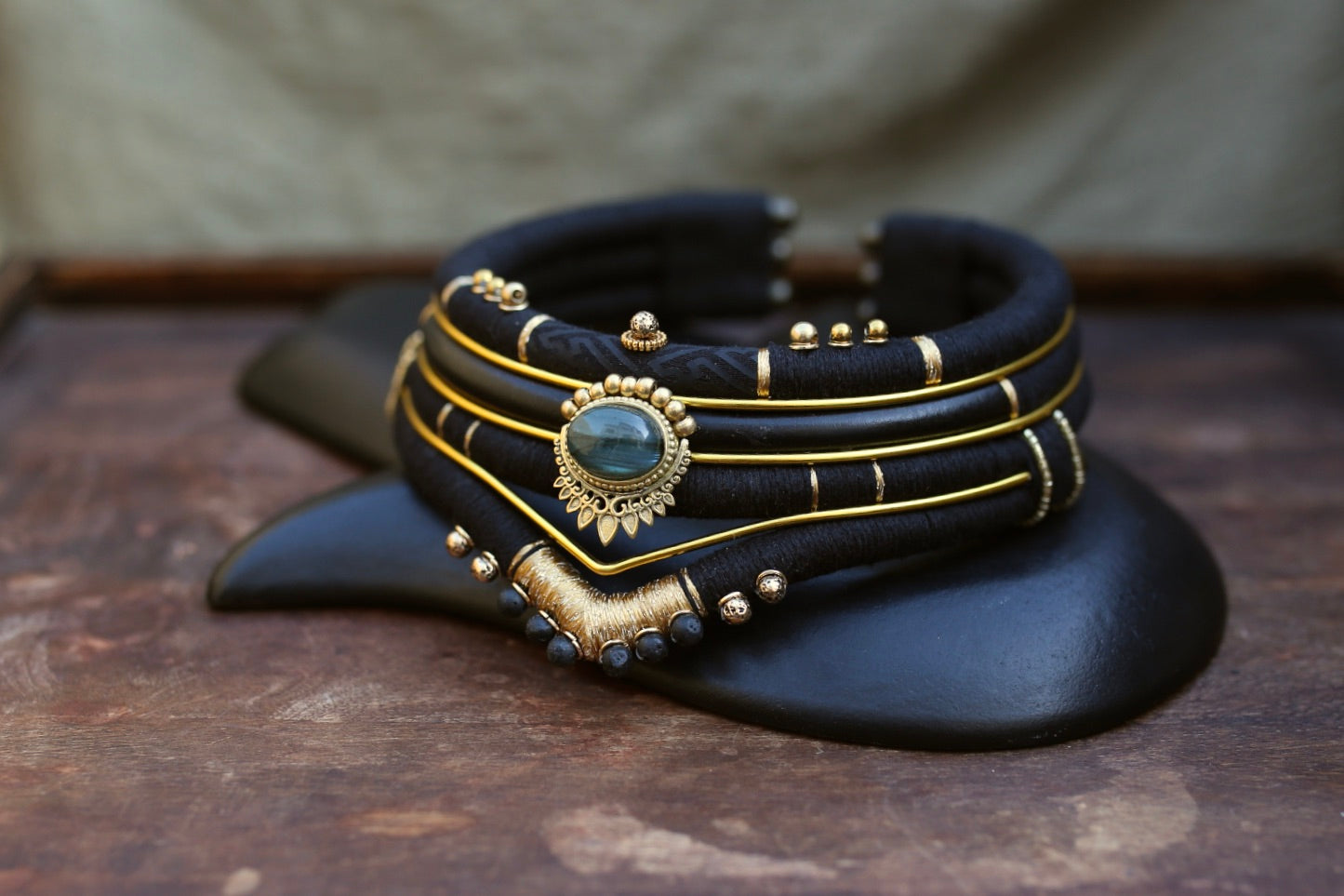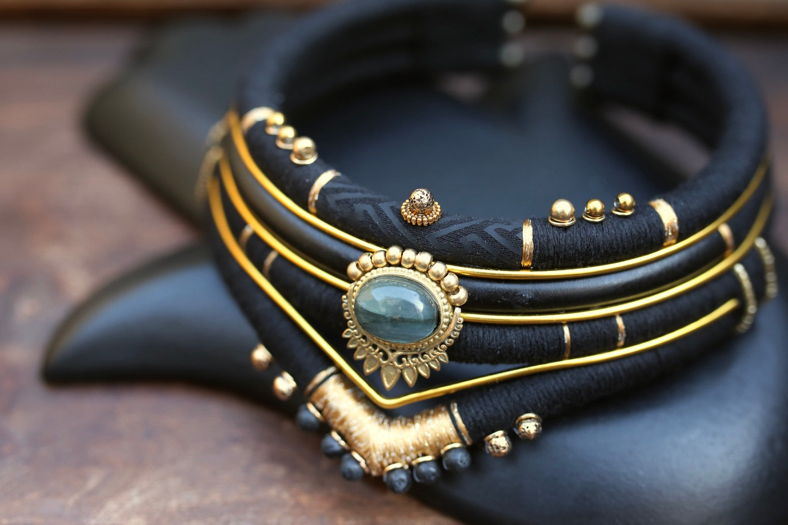 Collier à 4 rangs réalisé à la main avec du fil de coton noir, mon tissu sayagata, et des tubes en laiton doré.