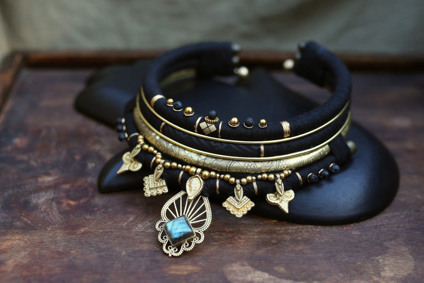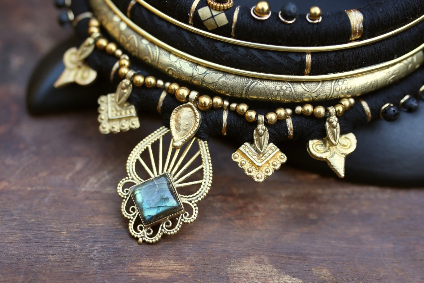 une labradorite carrée, mise en valeur dans un pendentif ornemental.