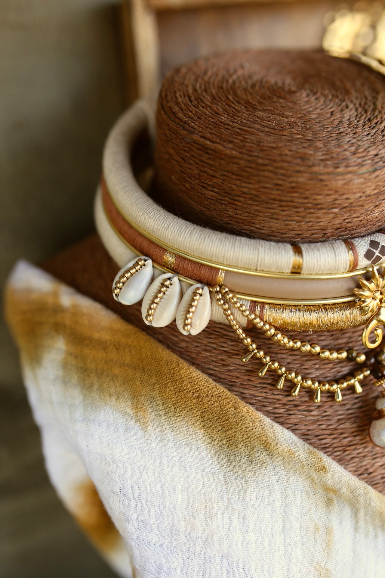 Chaque coquillage est cousu à la main avec précision, apportant une touche artisanale unique. Des motifs berbères viennent orner le tissu central, en hommage aux racines ethniques et nomades de cette création.