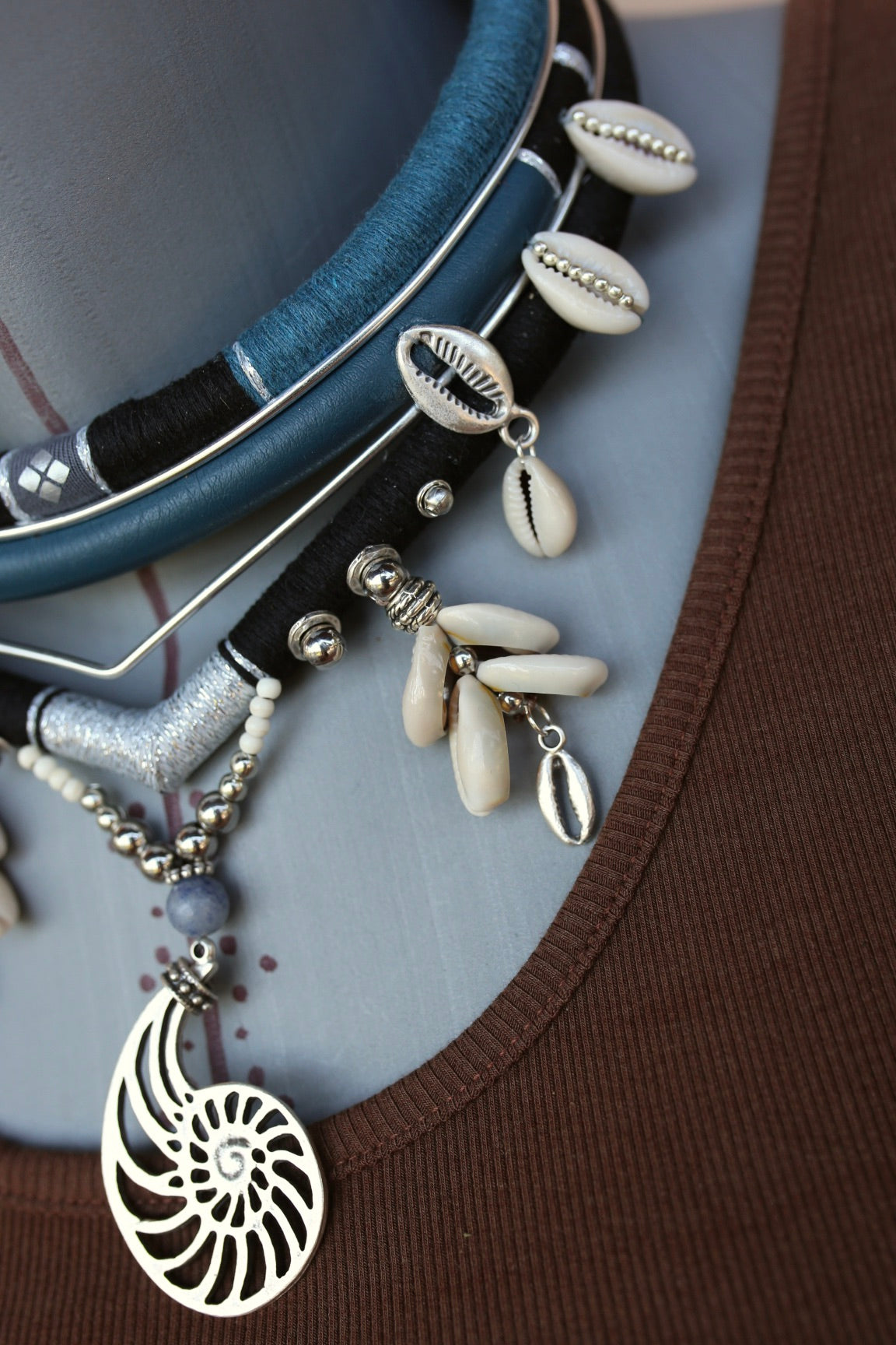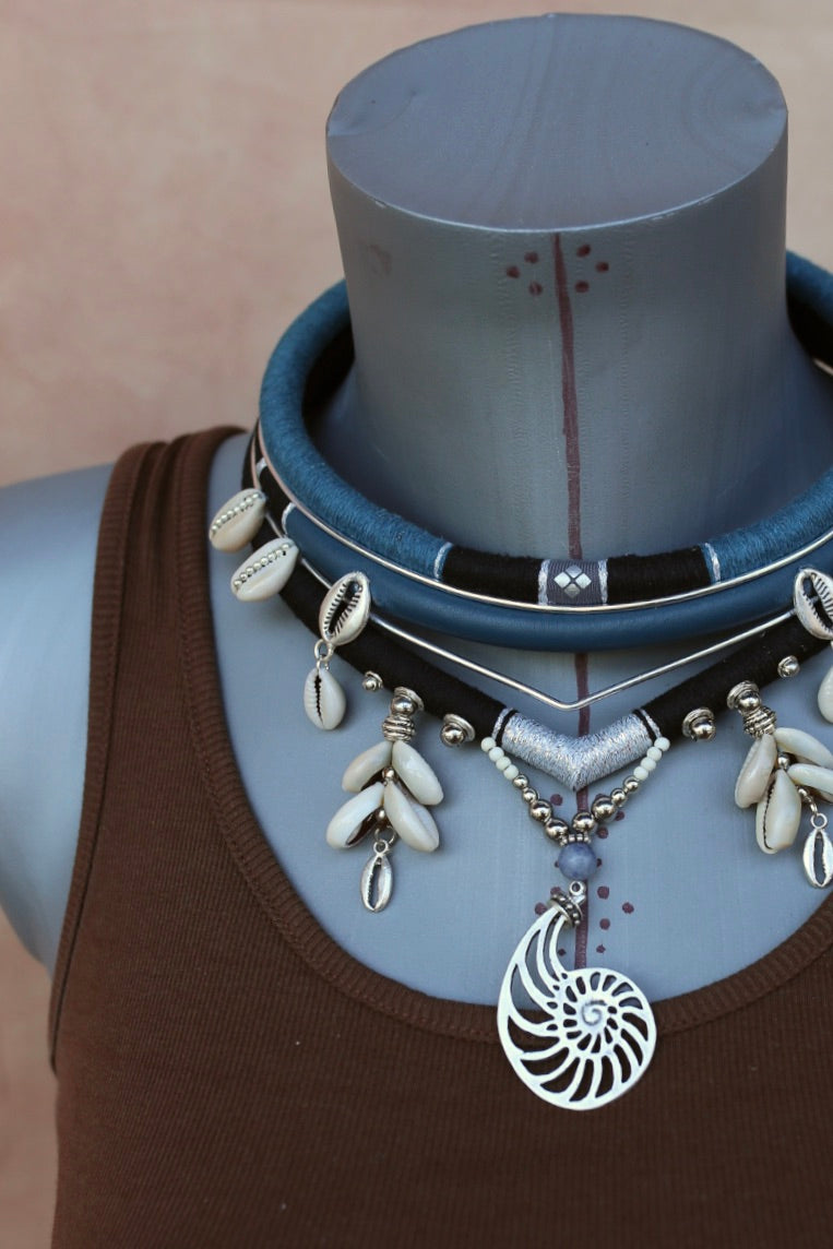Collier à deux rangs, mêlant fil de coton bleu océan et noir avec détails argentés, décoré de coquillages naturels et de perles. Il est sublimé par un pendentif central argenté en forme de spirale nautile, symbole d’harmonie et de voyage marin.