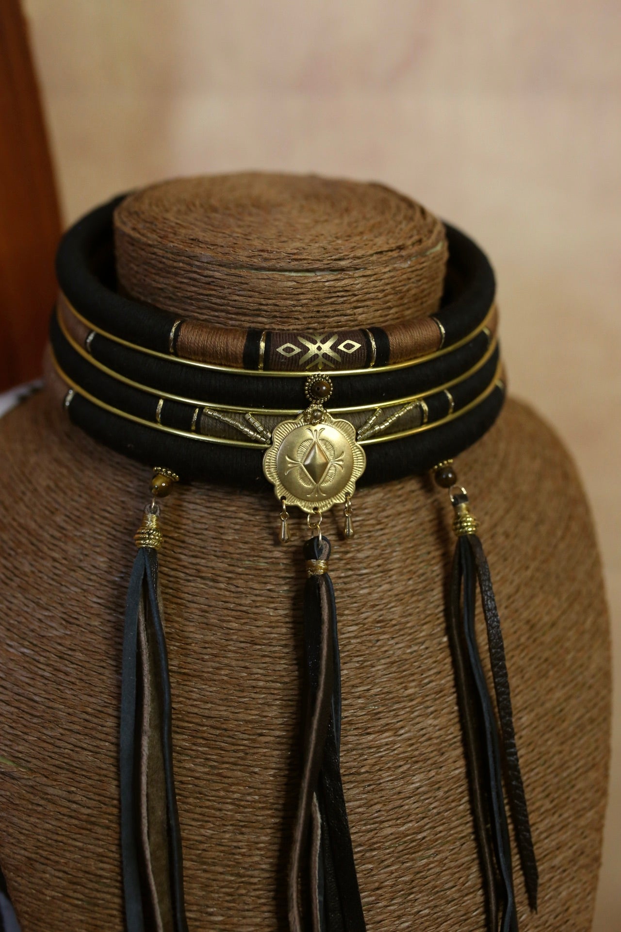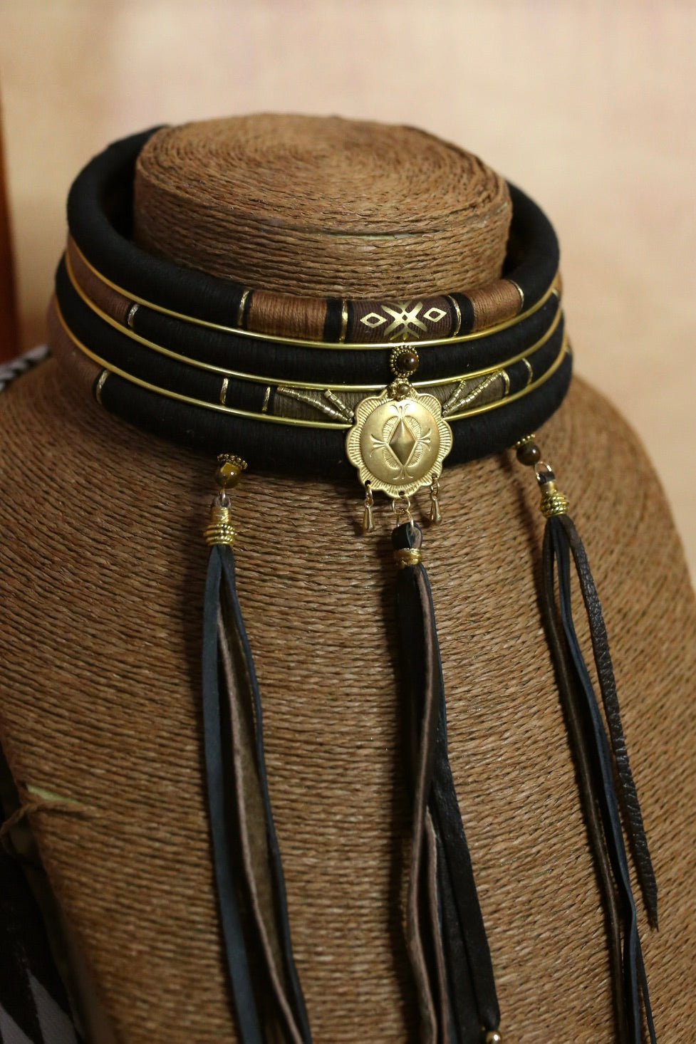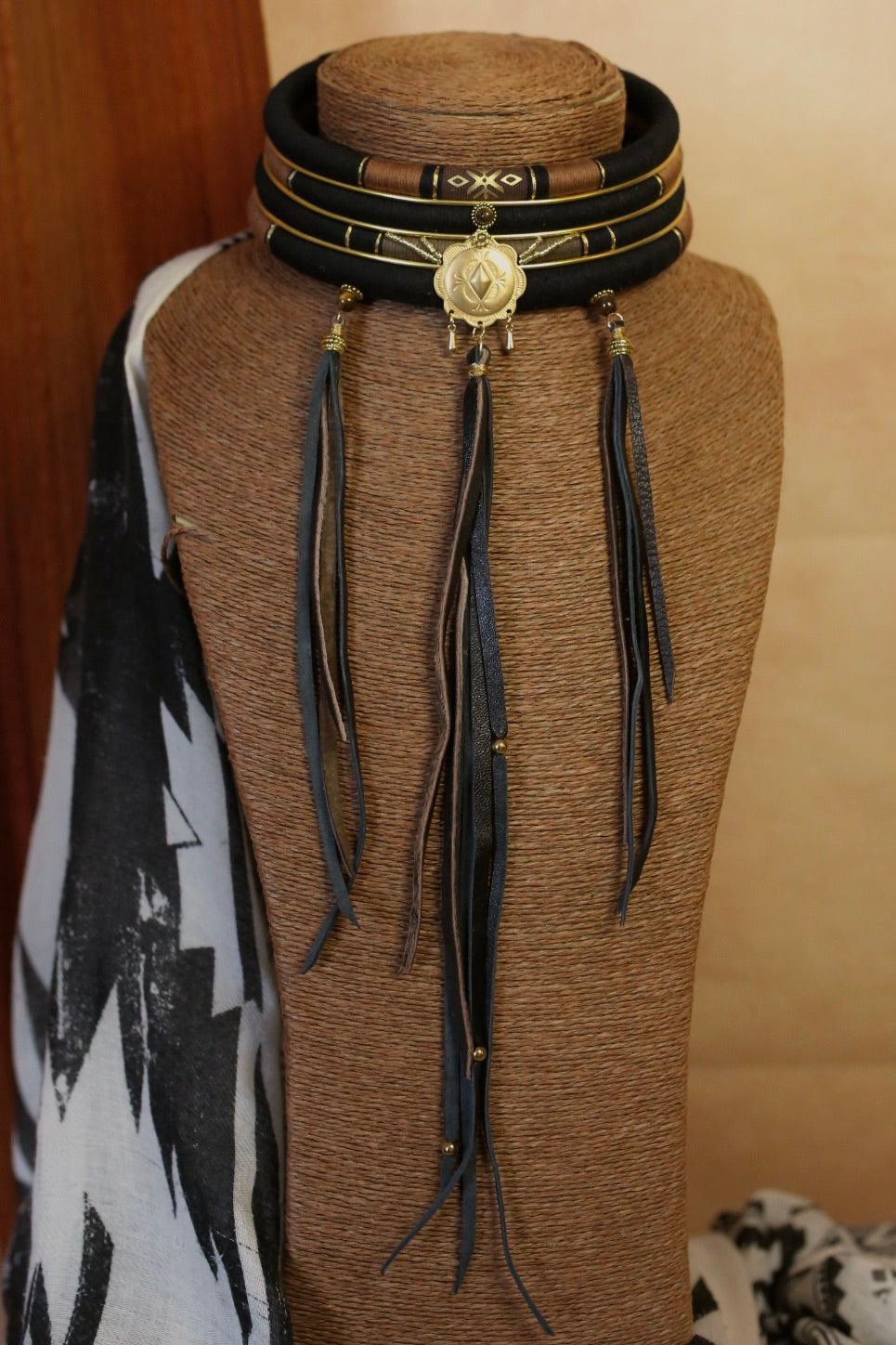 Un collier multi-rangs au style western/ethnique, pensé comme une pièce forte et lumineuse. Au centre, une grande médaille dorée apporte du caractère et une vibe cowgirl chic, accompagnée de pampilles délicates et de détails dorés. Les franges en cuir faites à la main viennent sublimer l’ensemble avec un mouvement sauvage et élégant.