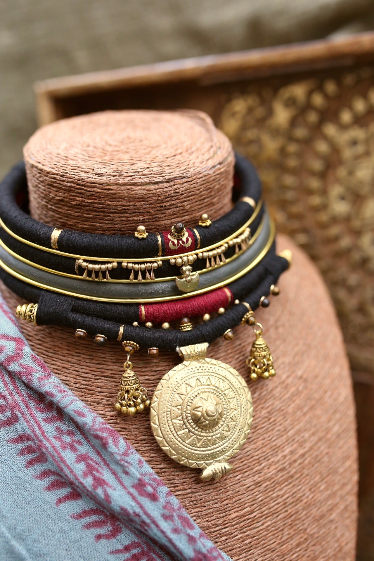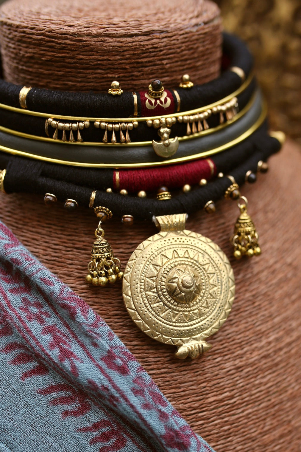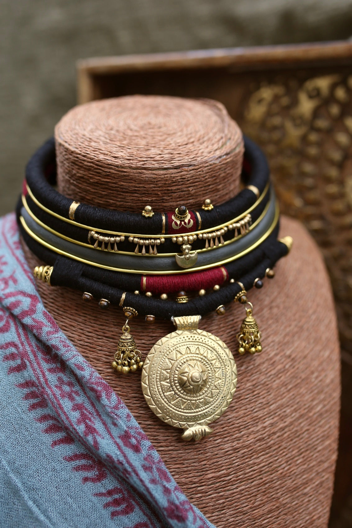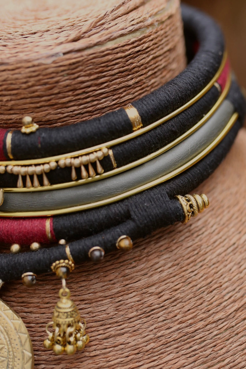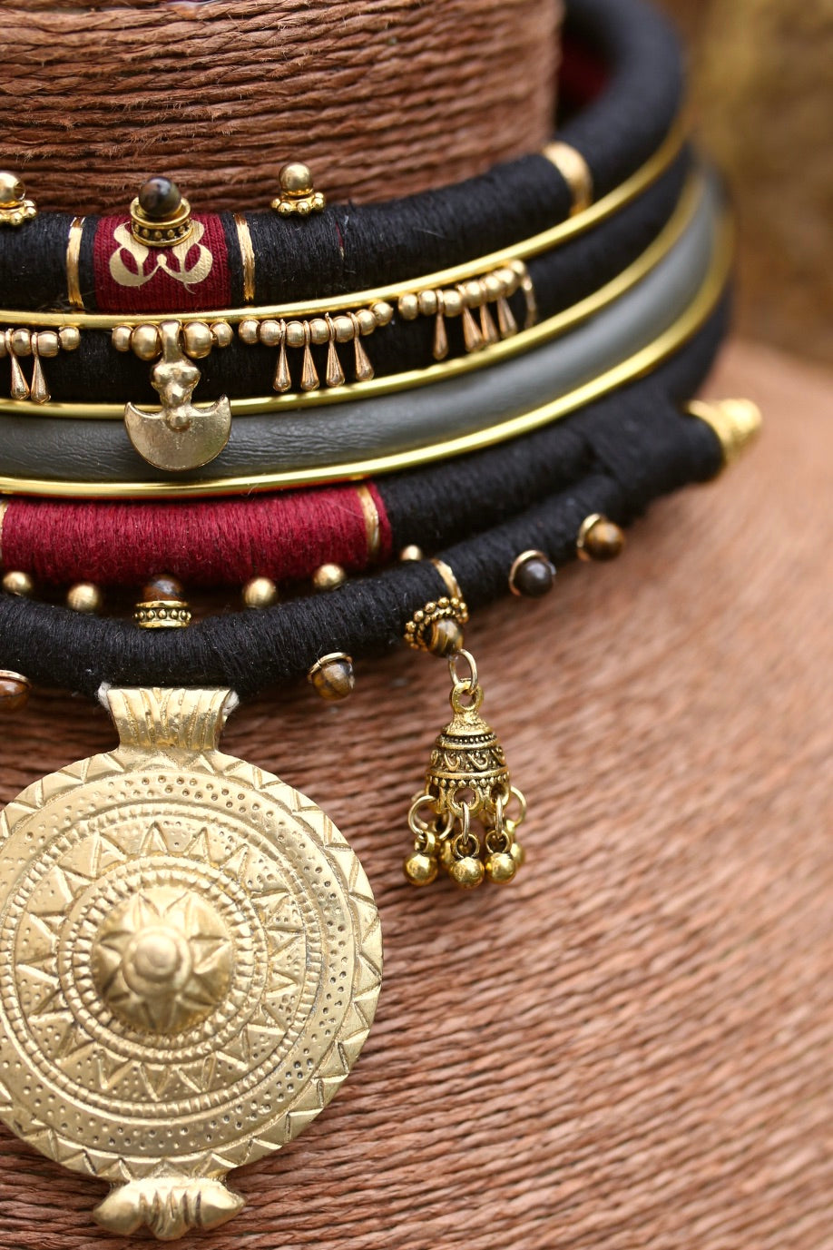 Composé de 5 rangs entièrement amovibles, il mêle fils noirs et bordeaux, lignes dorées, détails perlés et pampilles jhumka, sublimés par un large médaillon central gravé.