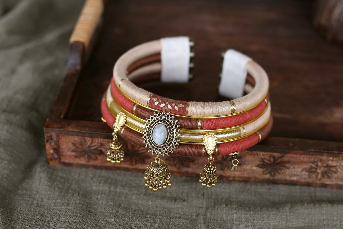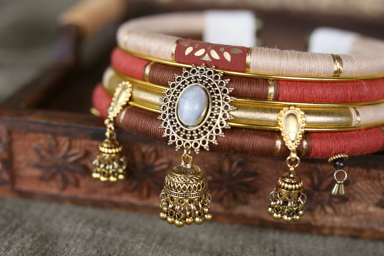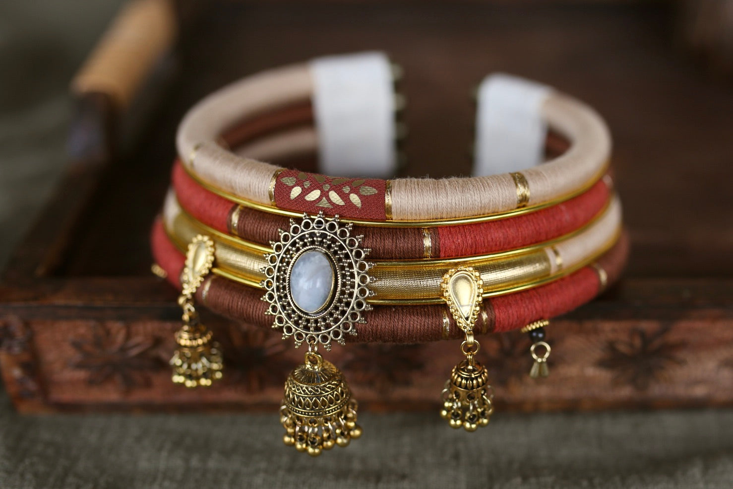 Ras-de-cou à quatre rangs dans les tons terracotta, marron, beige et doré. Orné de pendants en laiton doré finement travaillés et d’un médaillon central serti d’une pierre de lune ovale, il incarne l’élégance mystique et solaire de la collection Mehndi Wild.