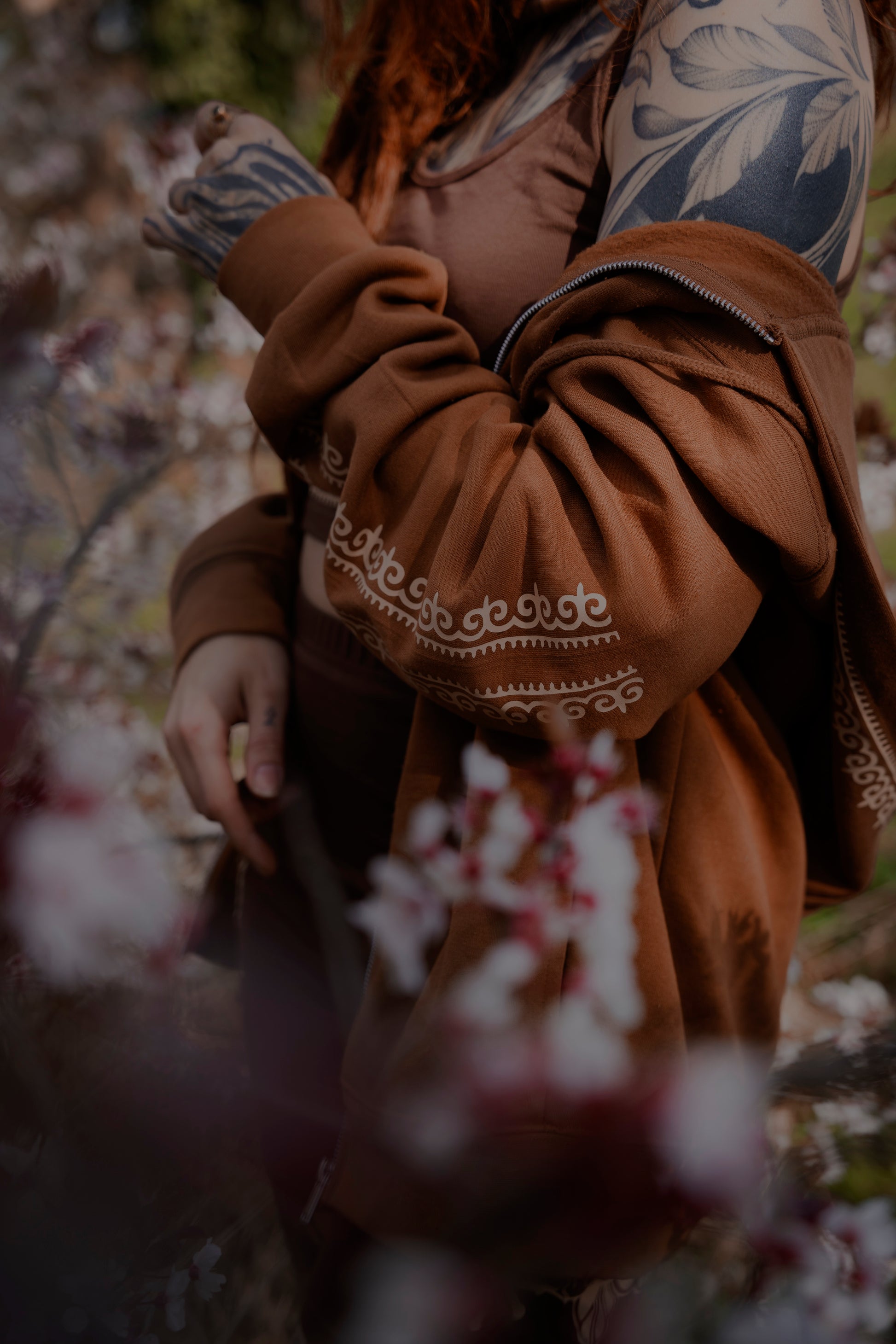 Ce sweat à capuche marron, confectionné en coton doux, est orné à la main d’un détail beige inspiré des motifs originaux signés Aavaara. Chaque pièce est réalisée sur commande, pour un vêtement à la fois confortable, singulier et chargé de sens.
