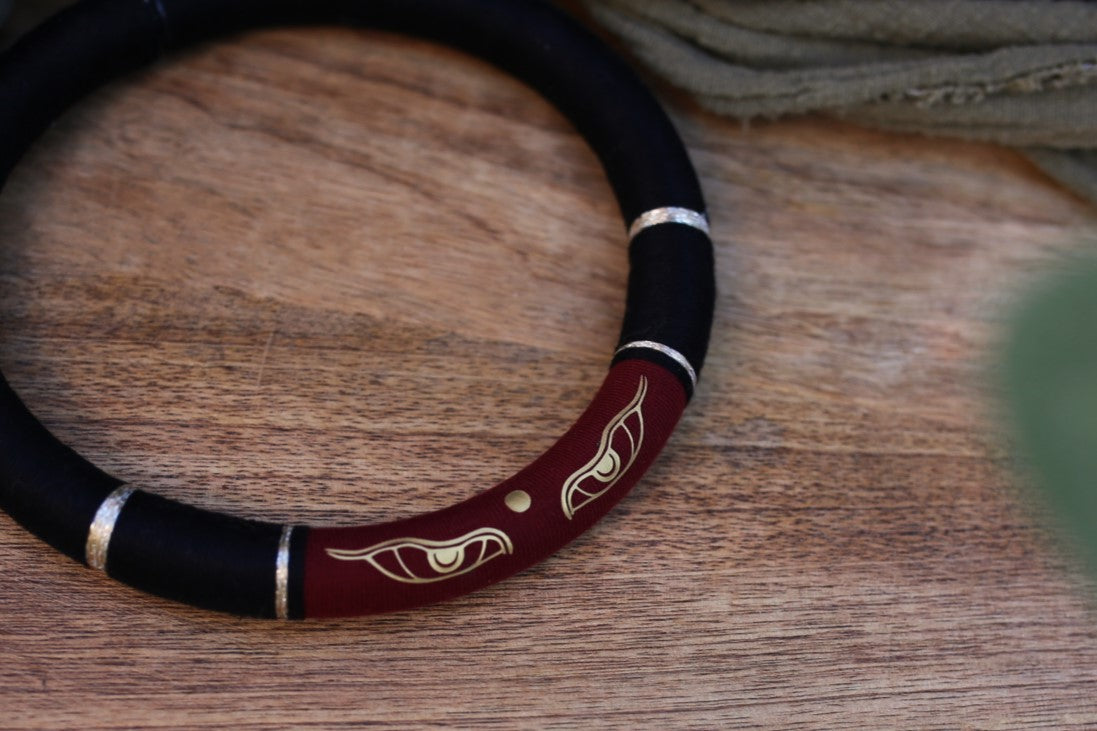 J'ai crée cette collection avec des tons type de la culture tibétaine et des matières tel que le coton. Mais surtout avec du tissu que j'ai fait sur mesure avec deux symbole fort tel que les yeux de Buddha & un mantra (ॐ मणि पद्मे हूँ / oṃ maṇi padme hūṃ)