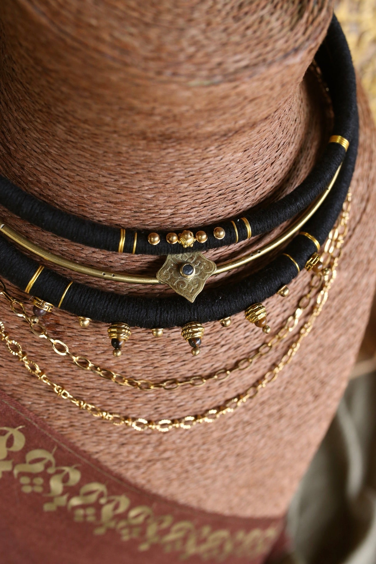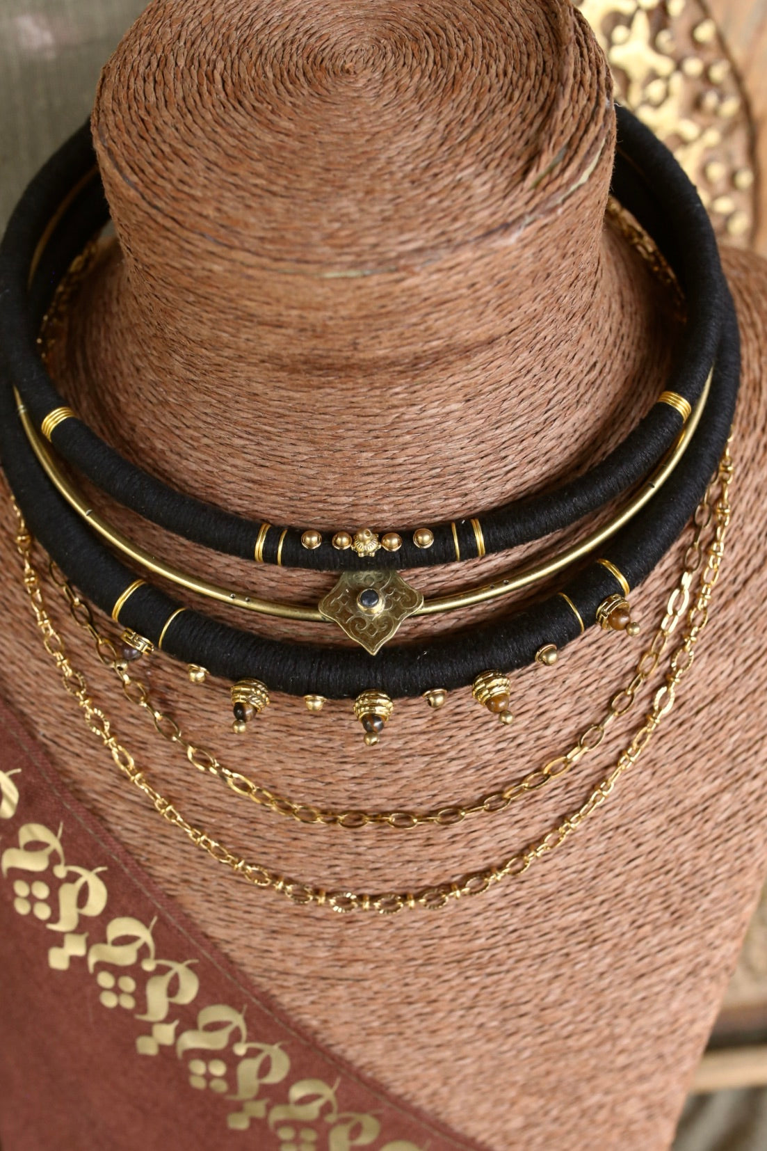 Ce torque unique à trois rangs marie force et élégance dans un style ethnique affirmé. Le rang central, en laiton ciselé, a été créé à la main par Alcor Bazaar, ajoutant une authenticité artisanale incomparable.