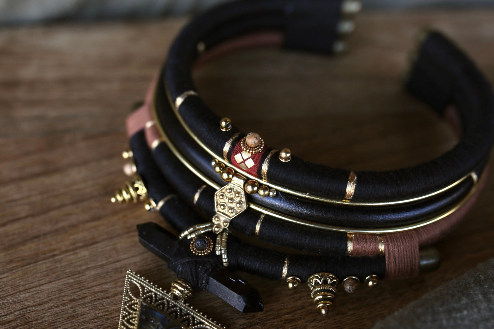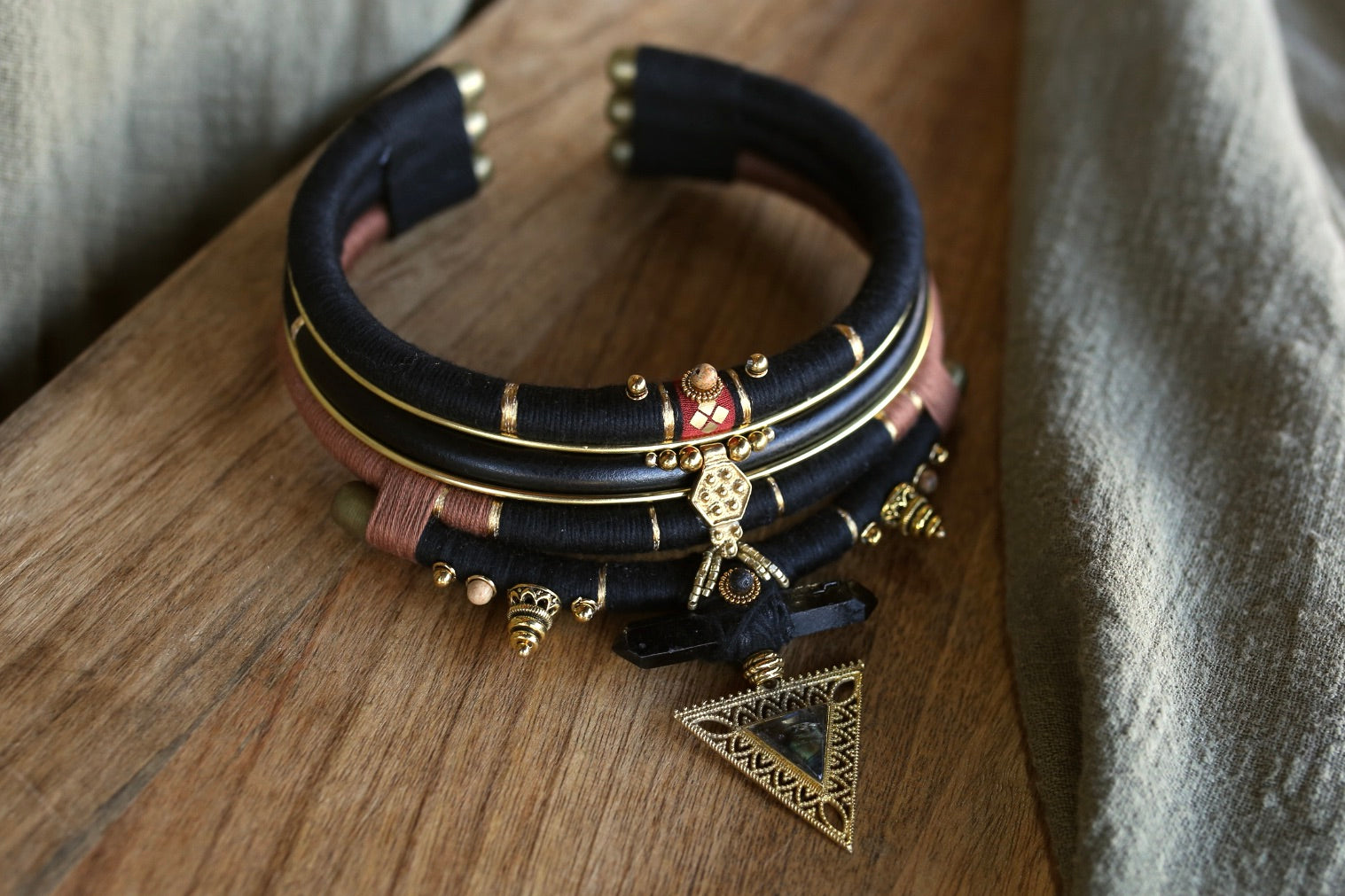 Collier multi-rangs totalement amovible, composé de 3 rangs en fil de coton noir, brun et terre cuite, finitions en laiton gravé et perles en acier inoxydable.