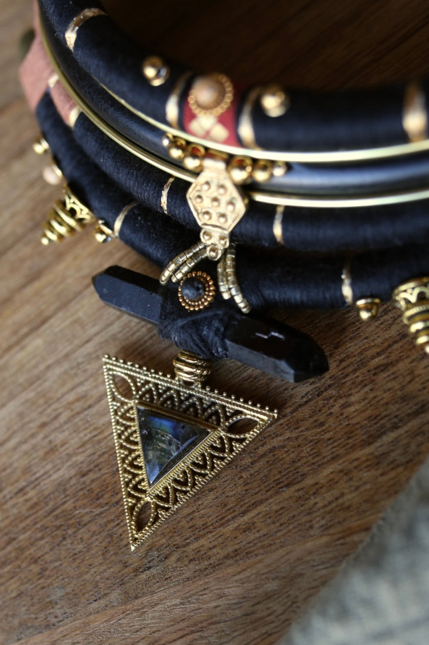La pièce centrale associe un cristal noir brut et un pendentif triangulaire en laiton orné d’une petite pierre labradorite, offrant une aura protectrice et symbolique.