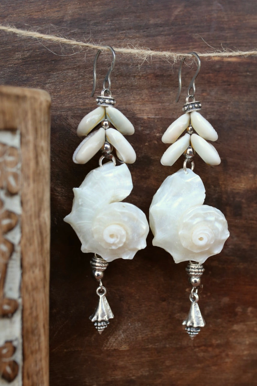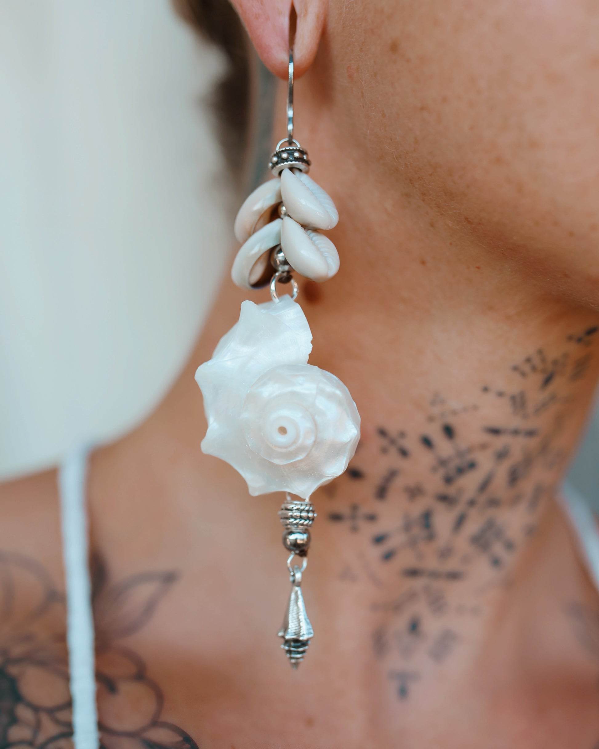 Boucles d’oreilles avec base en acier inoxydable, ornées de coquillages naturels et d’un imposant coquillage central sculpté. Finitions argentées avec breloque coquille, pour un style marin authentique et résistant à l’épreuve du temps.